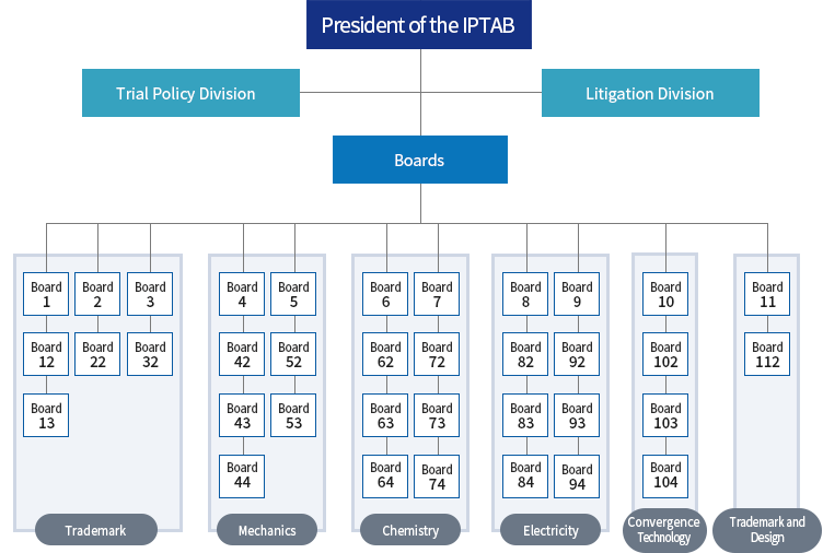 As shown in the organizational chart below, the IPTAB consists of 36 Boards, a trial policy division and a litigation division under the leadership of the President of the IPTAB. Each Board is managed by a chief presiding administrative judge and hears and decides trial and appeal cases with different technical fields. Trial policy division is a Board operations division which supports and administers proceedings and hearings and also conducts formalities examination, trial quality evaluation, etc. Litigation Division defends The IPTAB decisions before the Court for cases in which the Commissioner of the MOIP is the defendant.